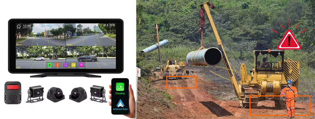 Los sensores emiten sonidos de alerta para el operador de maquina, y le proporciona una pantalla de 10 pulgadas para ir revisando los puntos ciegos mientras realiza la operación en terreno.